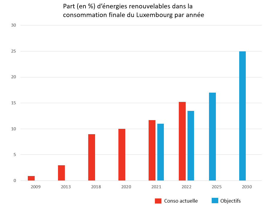 Ne crions pas victoire trop vite, avec les chiffres exposés ci-dessus, en 2021 le Luxembourg est en bas du classement de l?UE concernant la part d?énergies renouvelables dans sa consommation finale avec 11.7% en 2021 et 15.2% en 2022, contre une moyenne globale européenne de 21.8%.