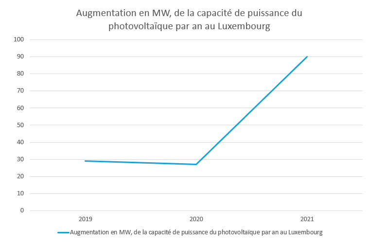 Au Luxembourg, l'utilisation de l'énergie solaire est de plus en plus répandue. Les panneaux photovoltaïques sont devenus une solution de choix pour les particuliers et les entreprises désirant réduire leurs coûts d'énergie et leur empreinte carbone. Un grand nombre de centrales photovoltaïques a émergé ces dernières années avec l?augmentation de la capacité de puissance du photovoltaïque : +29MW en 2019, + 27MW en 2020 et +90MW en 2021, pour atteindre une production de 23.9GWh, doublée encore en 2022, arrivant à 40.1GWh.